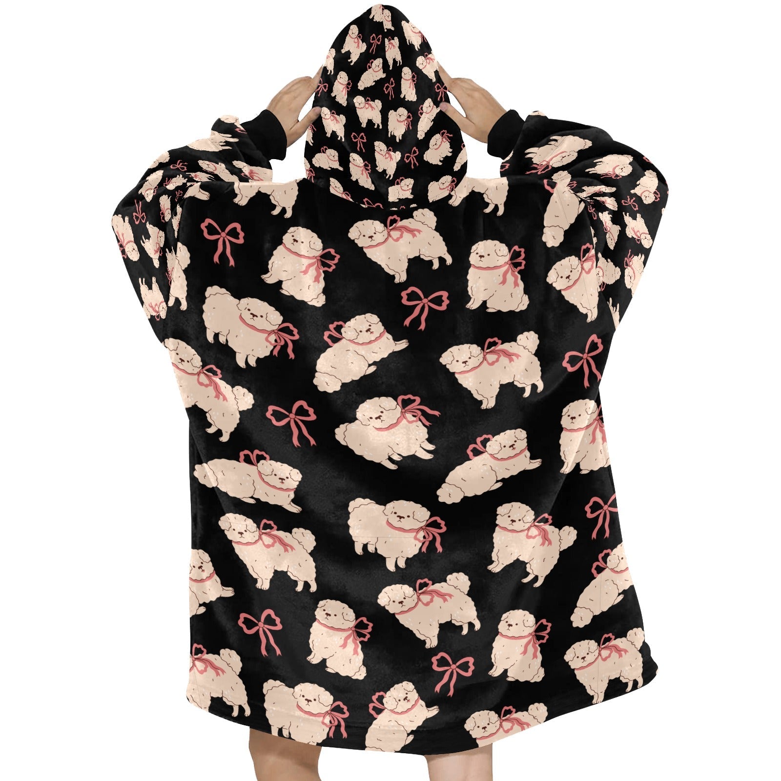 Fluffy Maltese Bliss with Bows Blanket Hoodie-Black-ONE SIZE-33