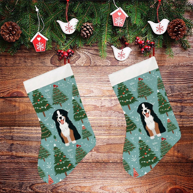 This stocking features a cheerful Bernese Mountain Dog amidst a wintry forest of beautifully adorned Christmas trees. The dog's tri-color coat contrasts splendidly with the soft teal background, reminiscent of a calm, snowy day. The falling snowflakes add a touch of winter's gentle serenity, enhancing the festive atmosphere.