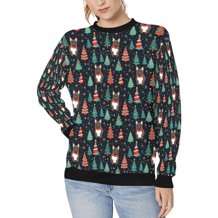 This Black/Brindle French Bulldog Festive Frolic Sweatshirt for Women captures the essence of Christmas. The design features French Bulldogs with jolly Santa beards against a starry night sky, surrounded by whimsical Christmas trees.