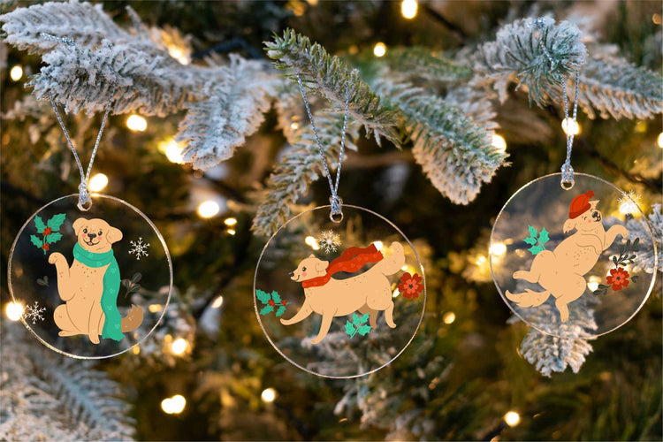 These ornaments feature three delightful designs and are sure to add an extra dose of holiday joy to your festivities. Crafted from high-quality acrylic, these Golden Retriever ornaments are carefully designed to capture the heartwarming essence of this beloved breed.
