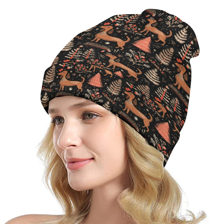 This beanie showcases an endearing Dachshund in a serene winter wonderland, set against a midnight black backdrop. The charming Dachshunds amidst festive pine trees, with soft neutrals and captivating coral and red accents, create a visually captivating scene.