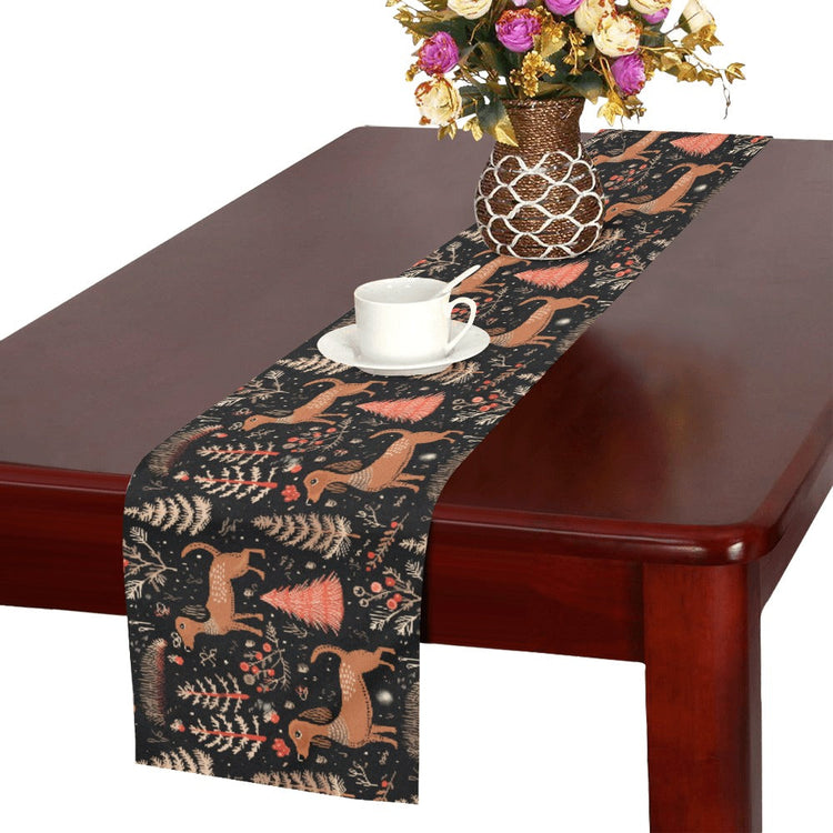 Adorn your festive table with the charm of the beloved Dachshund, set against a midnight black backdrop that brings out the festive spirit. This table runner is not just a decoration; it's a conversation starter, a piece that enhances the dining experience while celebrating the holiday spirit. The intricate design features a serene winter wonderland, dotted with festive forests of pine and playful Dachshunds, creating a cozy atmosphere for any holiday gathering.