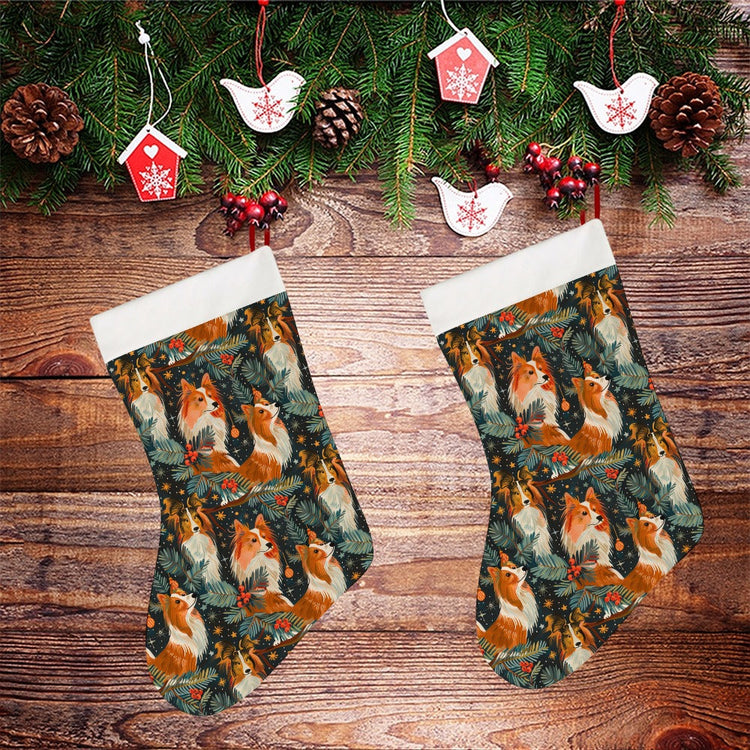Celebrate the magic of the season with the Christmas Starlight Shelties Christmas Stocking. This enchanting stocking features Shetland Sheepdogs, or Shelties, immortalized against a midnight sky canvas.