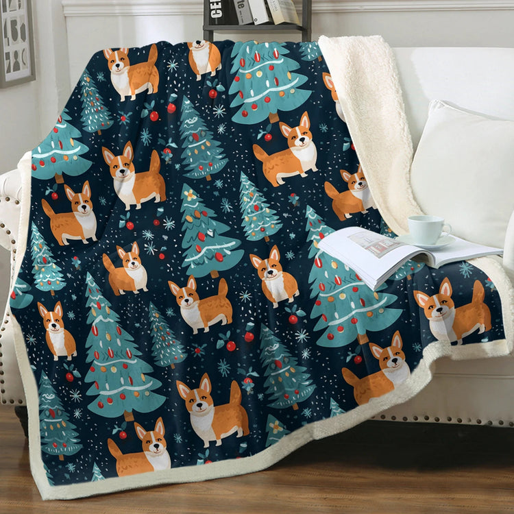 This exquisite blanket features a heartwarming pattern that is a true celebration of the holiday season. Adorned with the beloved Welsh Corgi, set against a festive winter backdrop, it captures the joyful essence of Christmas. The Corgis, renowned for their distinctive tan and white coats, are playfully interspersed between beautifully adorned Christmas trees and a cascade of gently falling snowflakes. The rich navy blue background highlights the warm tones of the Corgis and the vibrant reds and greens of the holiday decorations, creating a visually striking contrast.