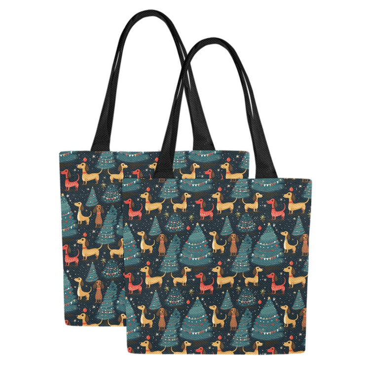 These tote bags feature an enchanting design, blending the holiday cheer with the whimsical appeal of Dachshunds, each dressed in festive attire against a backdrop of Christmas trees under a starlit sky.