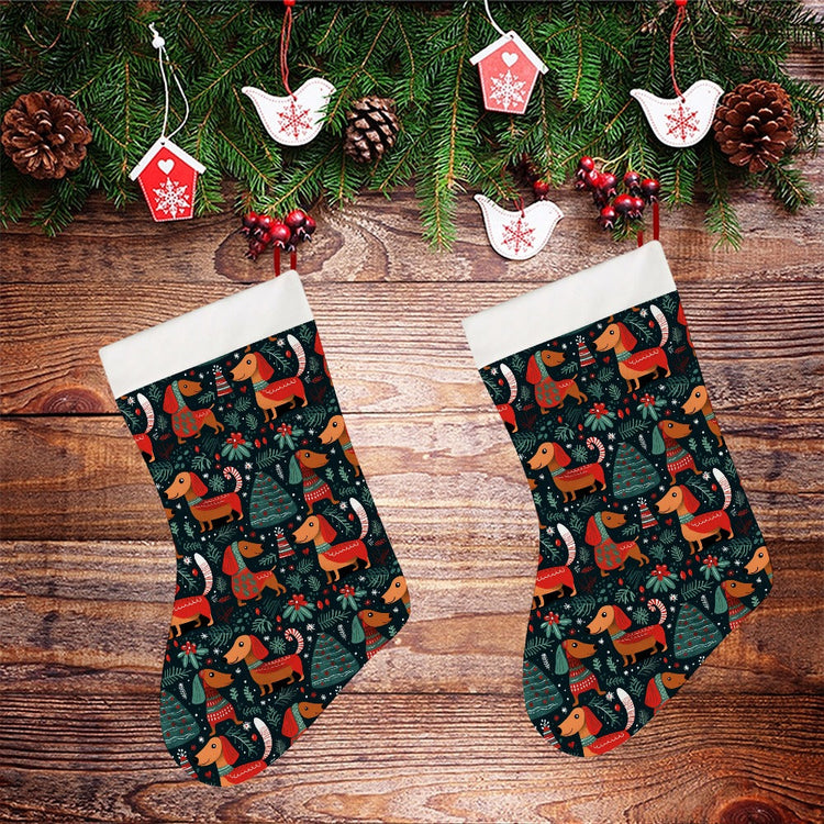This Christmas stocking bursts with the joyful essence of Dachshunds in festive sweaters, set against a rich dark green backdrop. The cozy, homemade feel of the reds, greens, and whites in their holiday attire, along with whimsical decorations, perfectly captures the lively and charming nature of the Dachshund breed. Crafted from soft plush material, it adds a touch of comfort and warmth to your holiday decor.