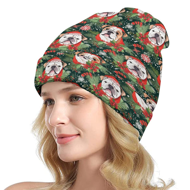 This festive beanie features an English Bulldog in full holiday attire, complete with Santa hats and classic Christmas greenery. The vibrant art style highlights the Bulldog's charming wrinkles and jolly expressions, making it a heartwarming addition to your holiday wardrobe.