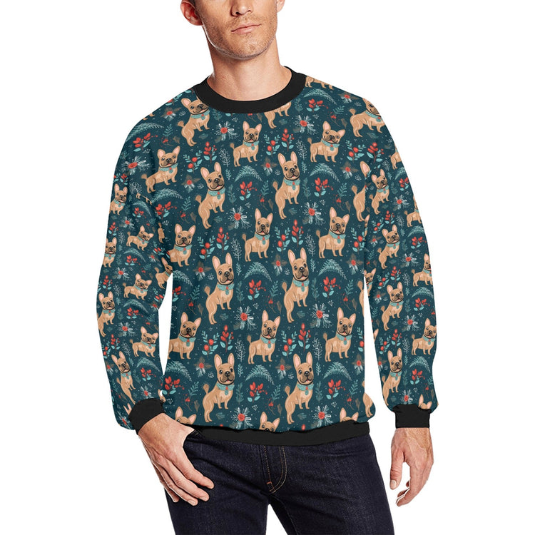 This sweatshirt features an exuberant pattern of cheerful French Bulldogs, each grinning with a decorative collar against a midnight blue backdrop. The playful pups are interspersed with festive winter foliage, from pine branches to holly berries, in rich shades of green and red.