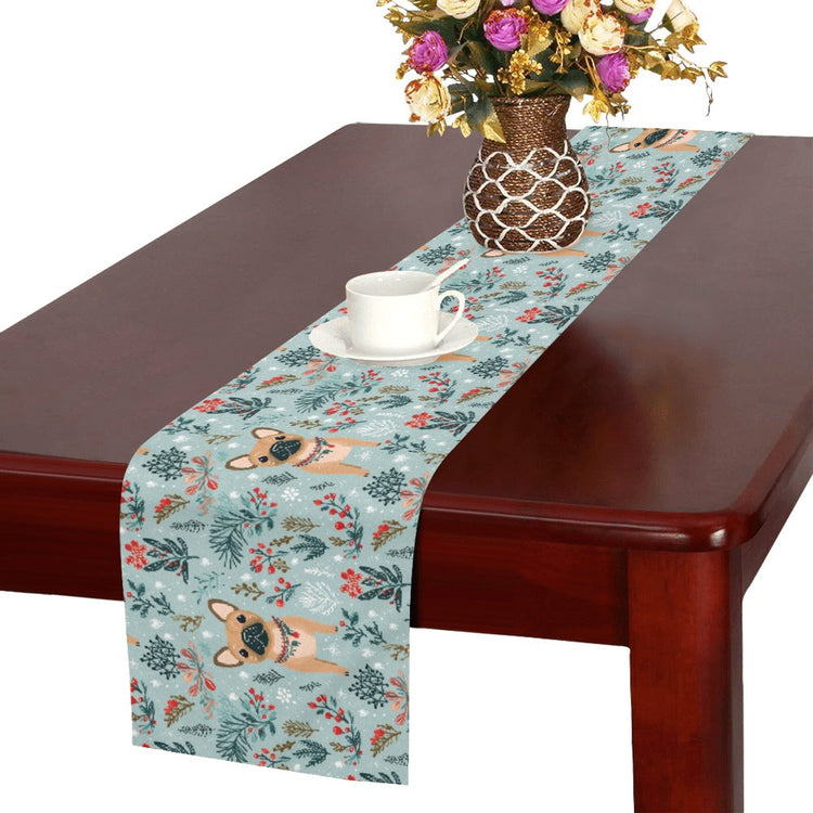Embrace the festive spirit with our Fawn French Bulldogs Frolic in Winter Botanicals Christmas Decoration Table Runners.