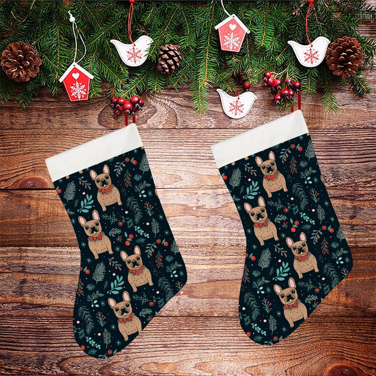 This charming stocking captures the spirit of the holidays with its "Festive French Bulldog Forest" pattern, featuring joyous French Bulldogs set against a wintery botanical backdrop.