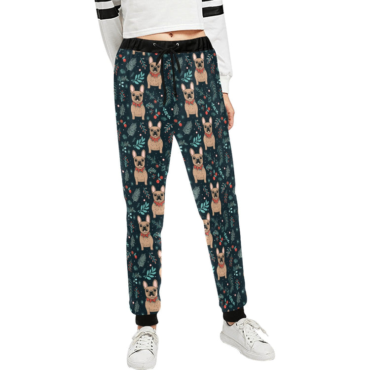 These sweatpants feature a "Festive French Bulldog Forest" pattern, showcasing joyous French Bulldogs amidst a wintery botanical backdrop. The midnight blue base is elegantly contrasted with vibrant red berries and green foliage, making it perfect for the holiday season.