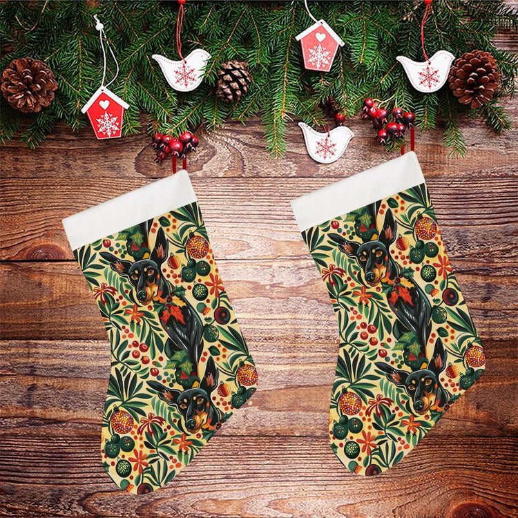 This stocking is a heartwarming tribute to Doberman lovers. It combines the spirited presence of Dobermans with a vivacious tropical holiday theme. The sleek black and tan coats of the Dobermans contrast beautifully with lush greens and bold reds. Intricate ornaments and gifts suggest festive preparation and gaiety.