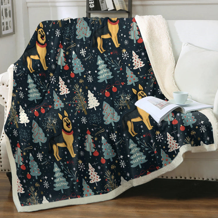 This exquisite blanket features a delightful winter landscape that brings the iconic German Shepherd into a vibrant Christmas setting. The dark, navy blue background, reminiscent of a peaceful Christmas eve night sky, beautifully contrasts with the warm tones of the German Shepherds and the merry hues of red, white, and green seasonal decorations.