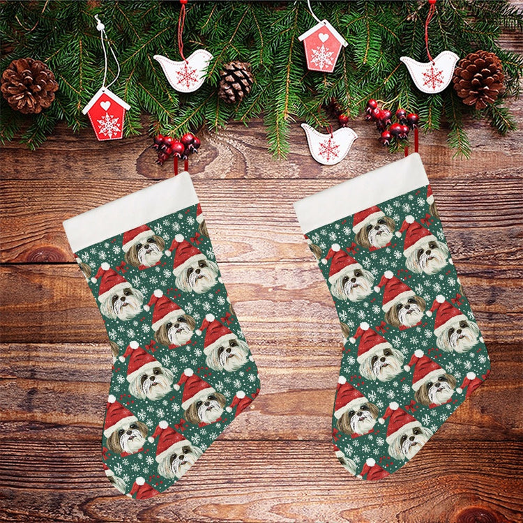 Wrapped in the cozy embrace of the season, this stocking features the adorable Shih Tzu breed. The fluffy faces of Shih Tzus, adorned with iconic red Santa hats, bring a touch of whimsy to classic holiday attire.