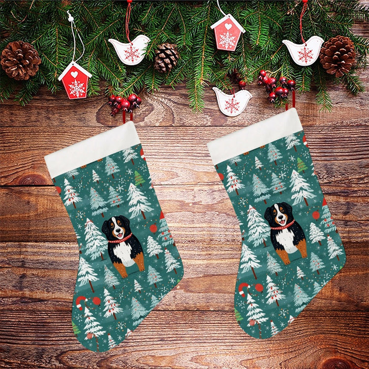This whimsical stocking features an adorable Bernese Mountain Dog amidst a snowy grove of Christmas trees. The dog, with its friendly smile and eyes full of mirth, sits proudly among festive firs decorated with red ornaments and candy canes.