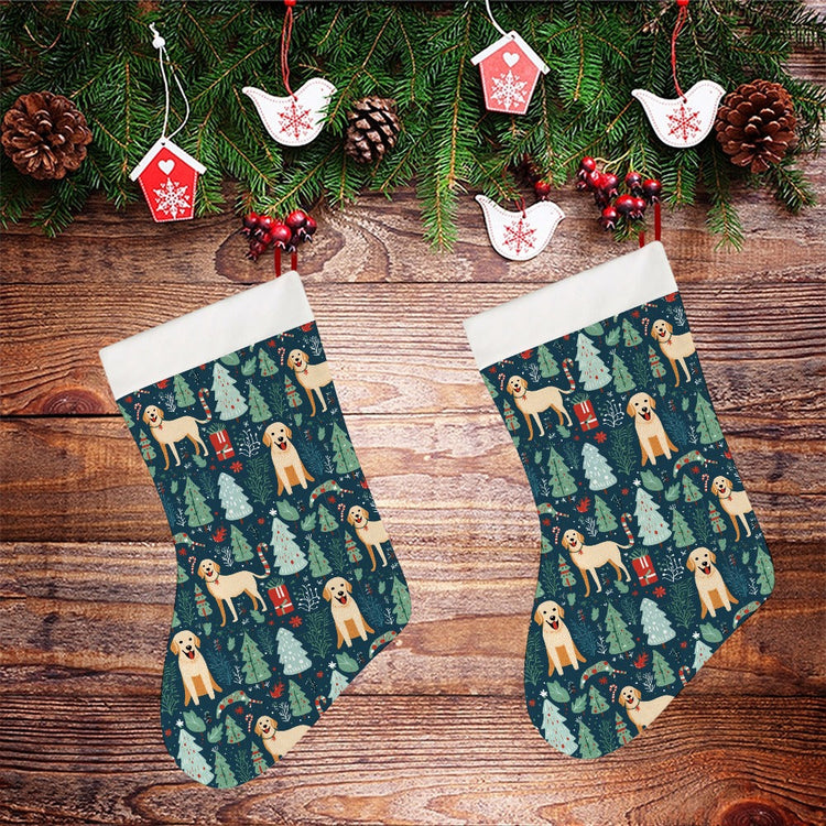 This enchanting Christmas stocking features cheerful Labrador Retrievers set against a whimsical backdrop of Christmas trees and festive gifts. The cool teal fabric is beautifully accented with the traditional colors of the season - red, white, and green.