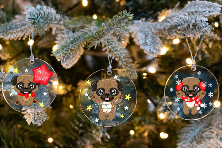 These delightful ornaments come in five adorable designs, each showcasing the lovable features and unique coat color of apricot Pugs. With a transparent background, these ornaments seamlessly blend with the natural beauty of your tree, creating a whimsical and enchanting display.
