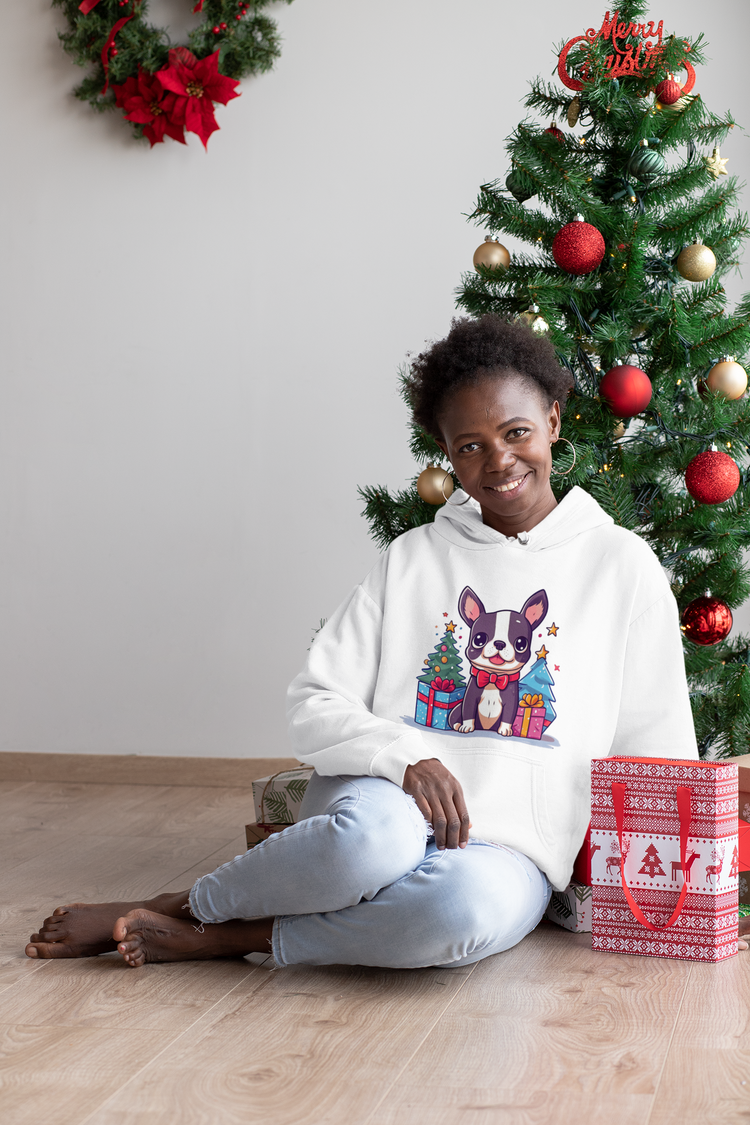 This hoodie sweatshirt features an adorable design of the cutest Boston Terrier surrounded by Christmas trees and presents, capturing the joy and excitement of the holiday season.