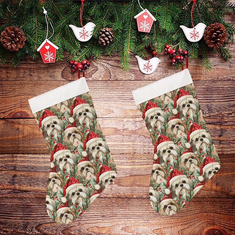 This stocking features Shih Tzus in Santa caps, their eyes gleaming with seasonal joy. Surrounded by pine needles and holly berries, these adorable canines embody Yuletide cheer.