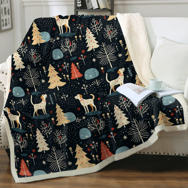 This exquisite blanket showcases a pattern that captures the magic of a starlit winter night, featuring poised Labradors amidst holiday trees and snowflakes. The design's crisp black backdrop, reminiscent of the night sky, is beautifully complemented by the soft gold of the Labradors and the whimsical pastels of Christmas decorations. Its playful mix of traditional and modern art styles gives this blanket a unique charm, making it a sophisticated choice for enhancing your holiday decor.