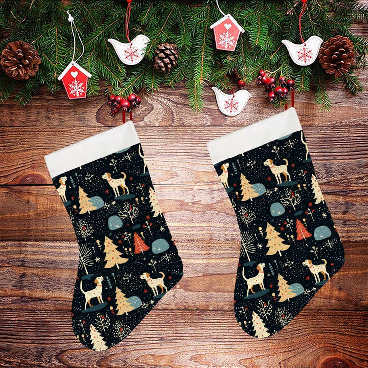 This playful mix of traditional and modern art styles endows the stocking with a unique charm, while the depiction of Labradors joyously frolicking among snowflakes and trees infuses your festive decor with warmth and dignity.