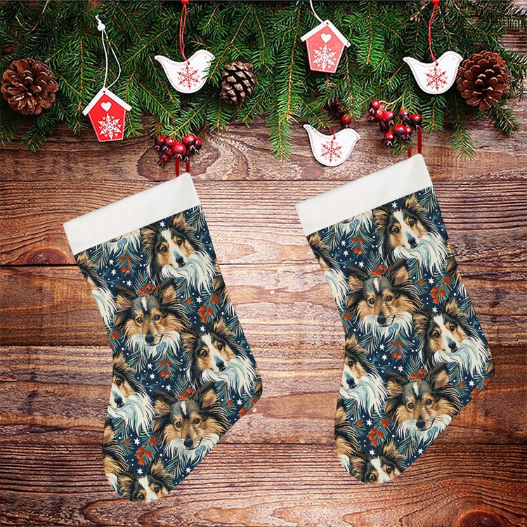 The Midwinter Dream Sheltie's Christmas Stocking captures the whimsical charm of Shetland Sheepdogs against a celestial tapestry. Their alert eyes reflect the wonder of the night sky, surrounded by stars, berries, and foliage.