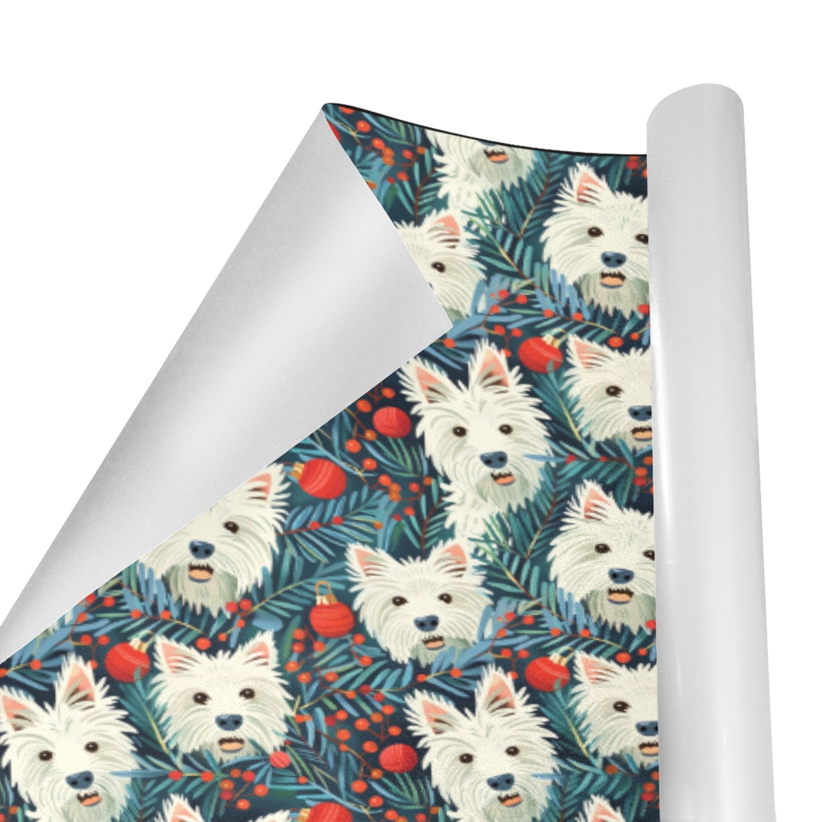 The Westies' snow-white fur beautifully contrasts with dark evergreen branches, evoking the magic of the first snowfall. Bright reds and deep greens in the berries and foliage invite you into a world of celebration and natural wonder.