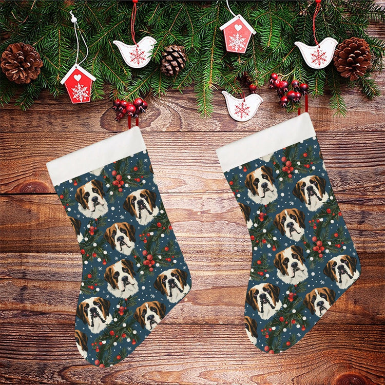 This exquisite stocking features a noble Saint Bernard amidst a festive tableau of snowflakes and seasonal flora. Their watchful eyes and serene demeanor bring a protective presence to your holiday decor.
