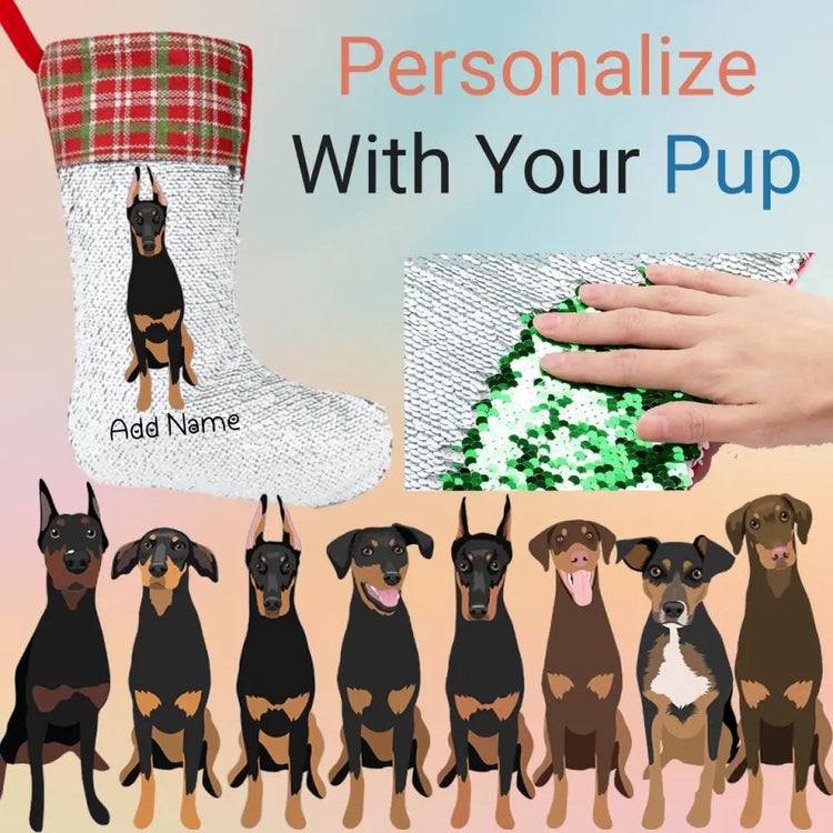 Make this Christmas unforgettable with the Personalized Doberman Shiny Sequin Christmas Stocking.