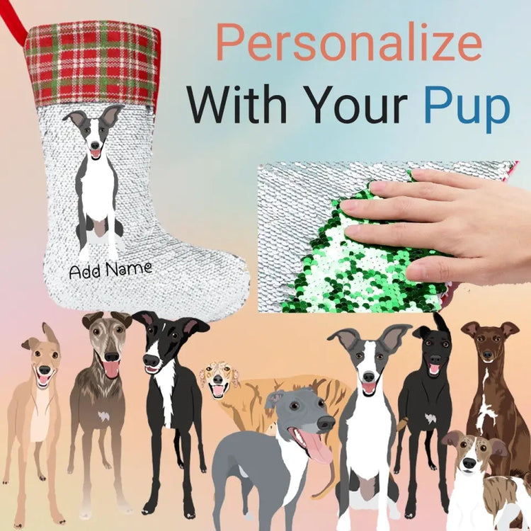 Personalized Greyhound / Whippet Shiny Sequin Christmas Stocking