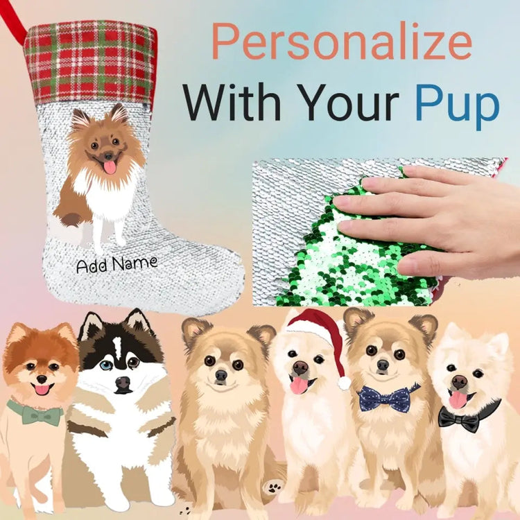 Enhance your holiday decor with our Personalized Pomeranian Shiny Sequin Christmas Stocking.