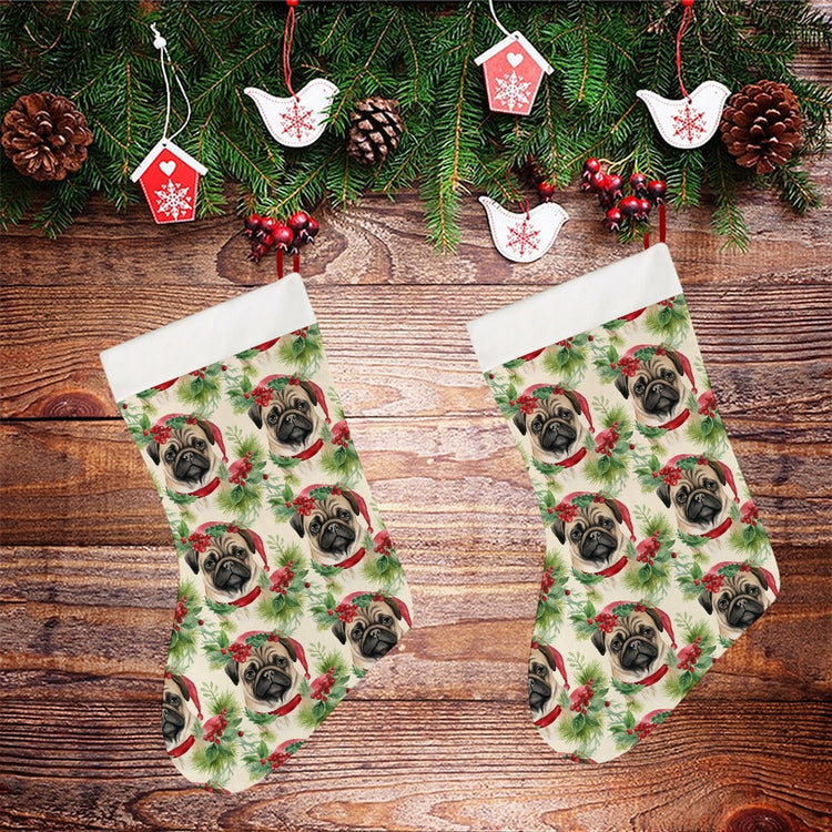 This Christmas stocking features a charming pattern of Pugs wrapped in holiday wreaths, set against a soft cream backdrop.