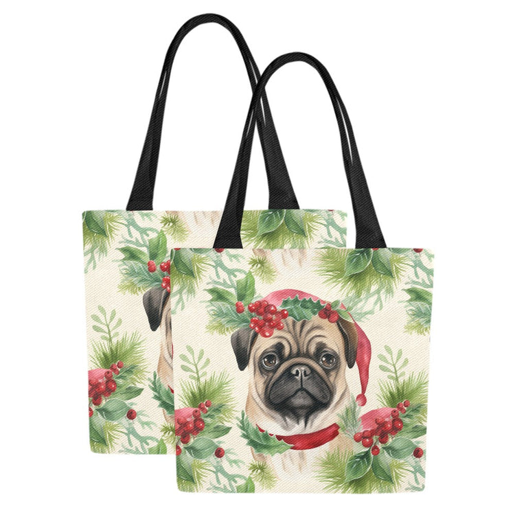 Embrace the festive cheer with our Pug in Holiday Wreath Elegance Large Canvas Tote Bags - Set of 2, a perfect blend of utility and festive spirit.