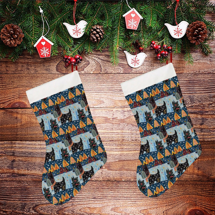 This composition is a symphony of holiday cheer and canine elegance, inviting viewers to immerse themselves in the cozy, jubilant setting. Designed to bring a smile to your face, it’s a perfect Scottish Terrier Christmas Stocking for those who cherish their furry friends.