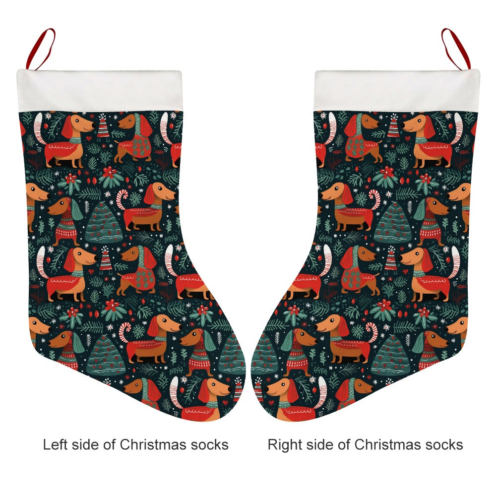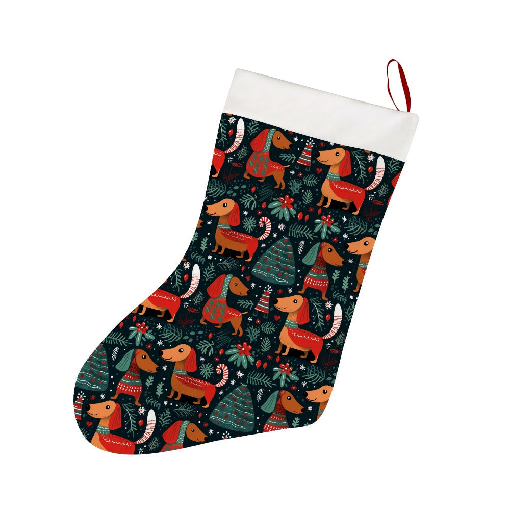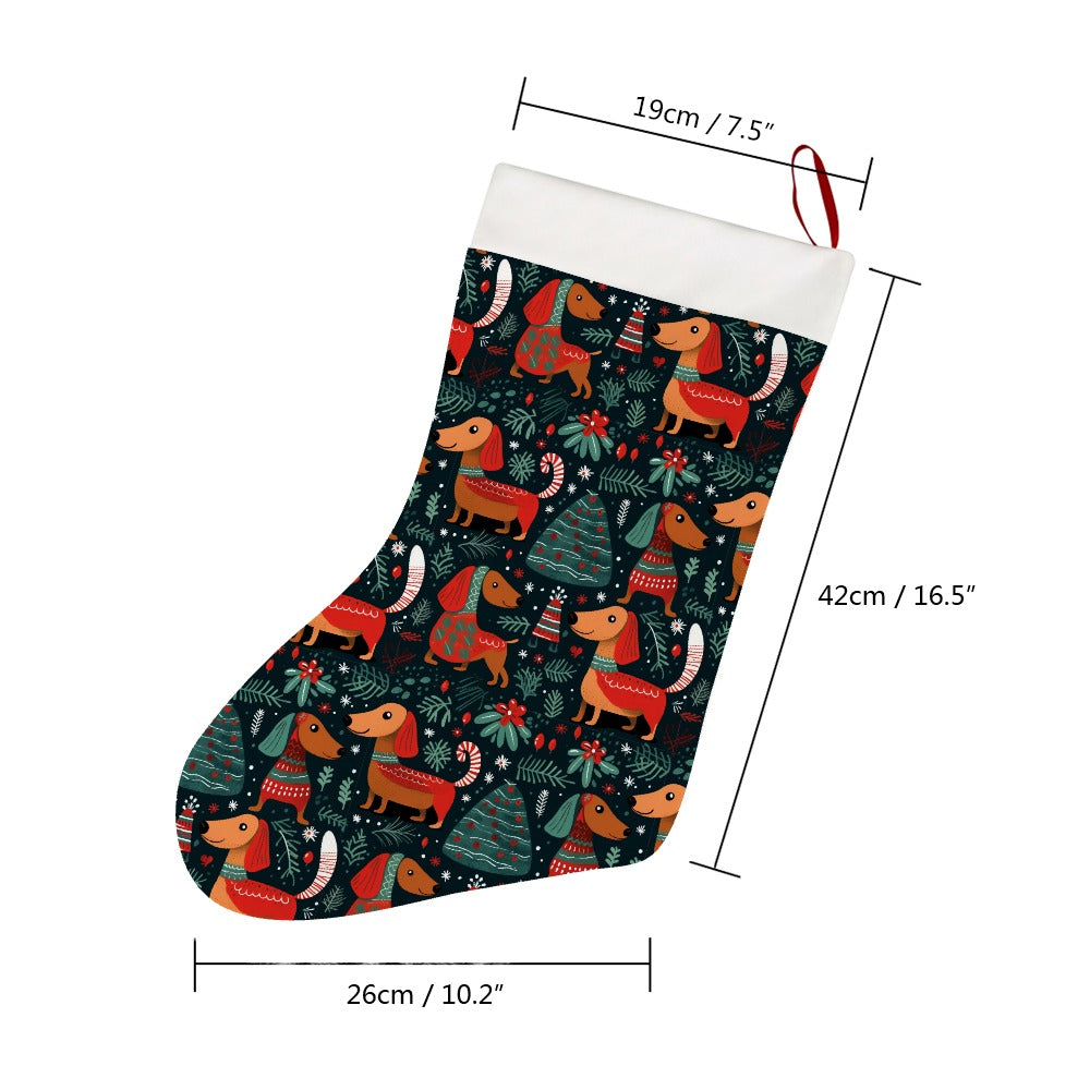 This Christmas stocking bursts with the joyful essence of Dachshunds in festive sweaters, set against a rich dark green backdrop. The cozy, homemade feel of the reds, greens, and whites in their holiday attire, along with whimsical decorations, perfectly captures the lively and charming nature of the Dachshund breed. Crafted from soft plush material, it adds a touch of comfort and warmth to your holiday decor.