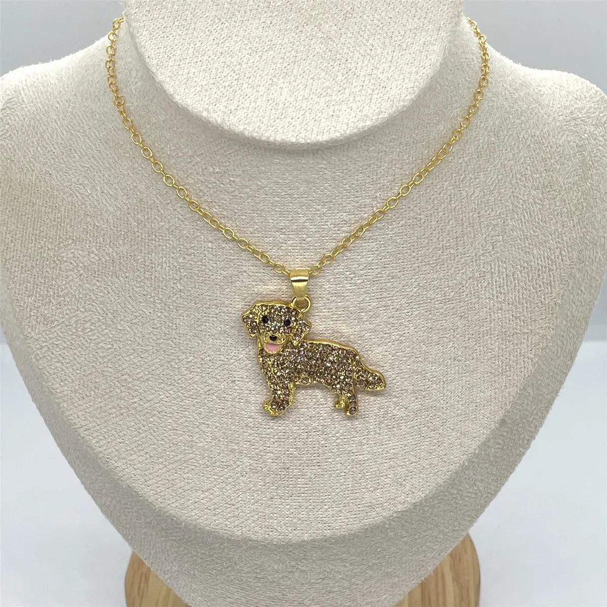 The Pendant features a Golden Retriever pendant with a friendly expression, floppy ears, and a flowing tail, all intricately detailed with sparkling rhinestones.