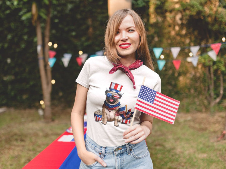 Our "All American Pug" Women's Cotton 4th of July T-Shirt is perfect for celebrating the holiday with pride and showcasing your love for Pugs. It's an ideal choice for attending parades, backyard BBQs, or simply lounging in style while enjoying the fireworks display.