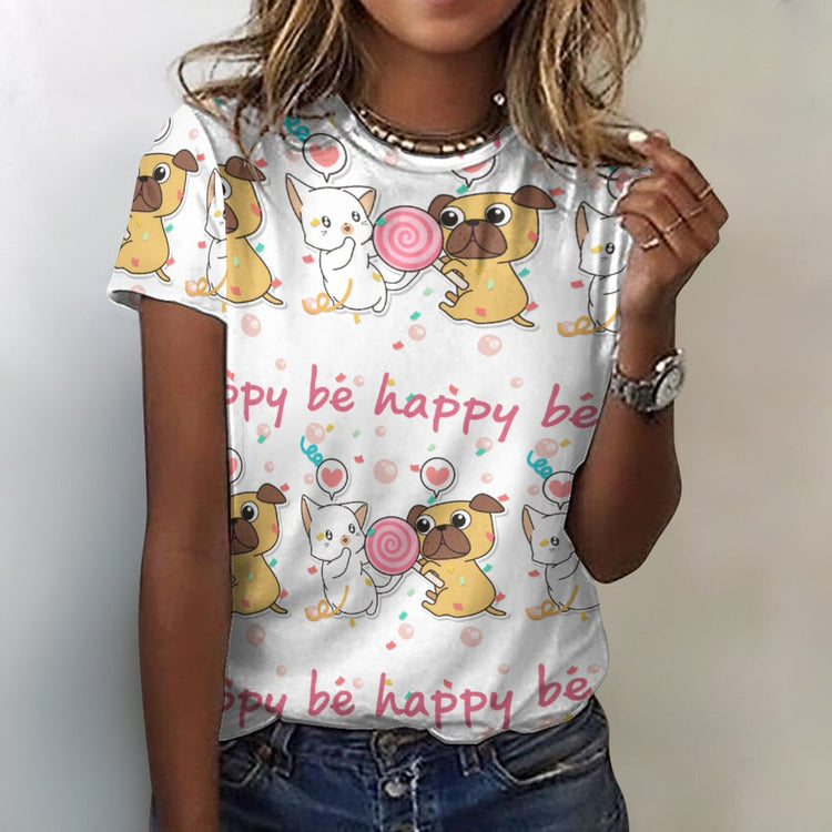Be Happy Pug Love All Over Print Women's Cotton T-Shirt - 4 Colors