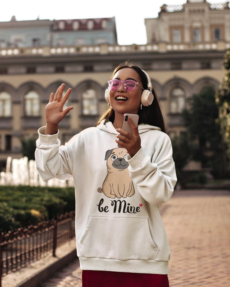 Embrace love and comfort with our "Be Mine Pug Love" Women's Cotton Fleece Hoodie Sweatshirt!