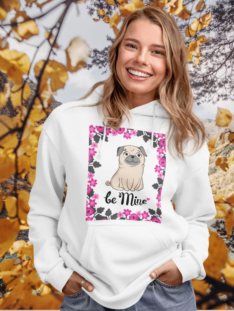 Embrace love and comfort with our "Be Mine with Flower Border" Women's Cotton Fleece Pug Hoodie Sweatshirt.