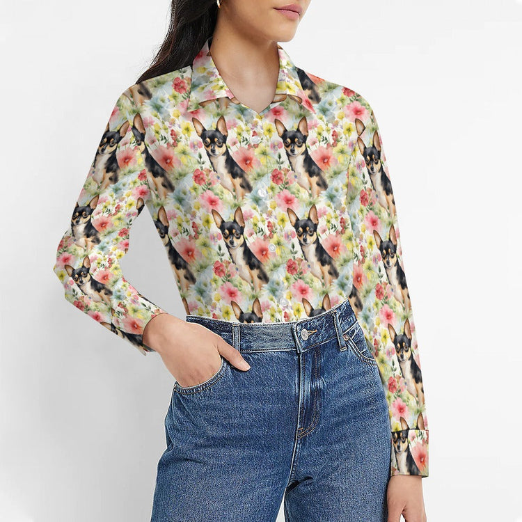 Embrace the joy and uniqueness of being a Chihuahua enthusiast with our Black and Tan Chihuahuas in Bloom Women's Shirt.