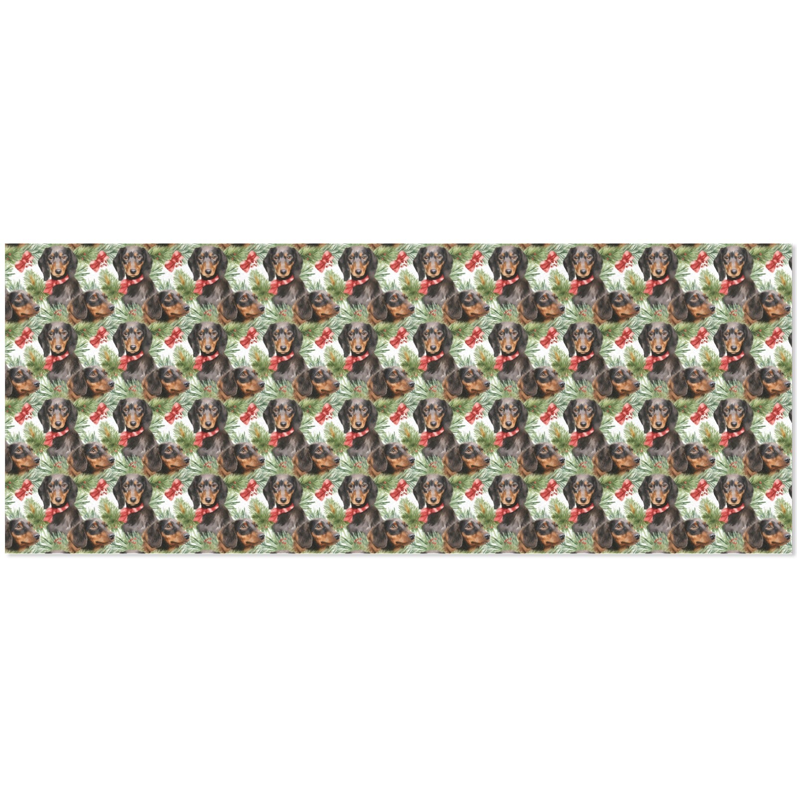 This delightful design features noble Dachshunds adorned in bright red holiday bows, set against a backdrop of fresh green Christmas foliage and red berries.