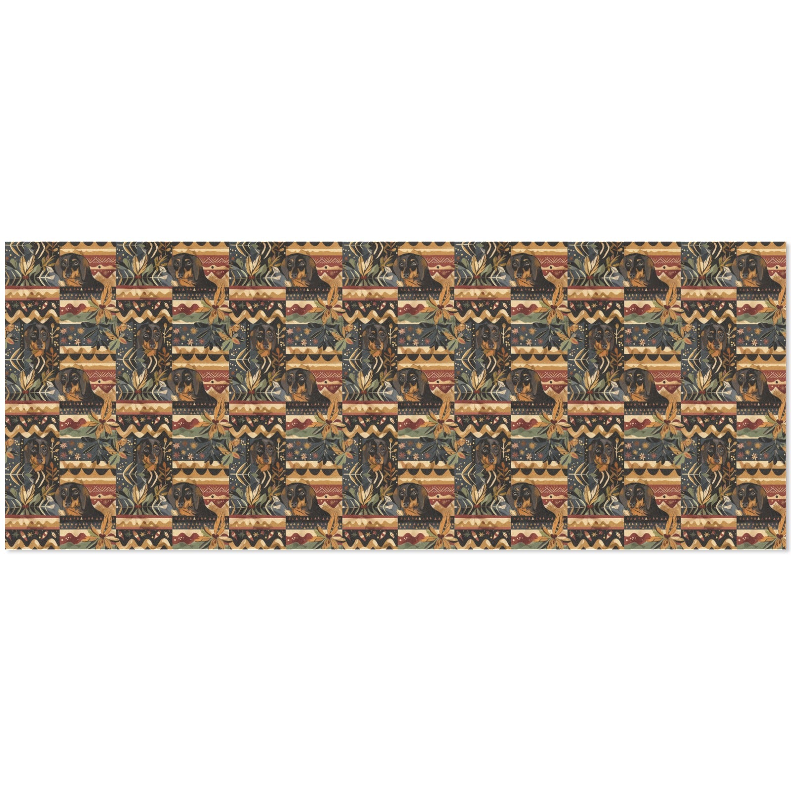 Each roll showcases expressive Dachshund faces framed by intricate patterns, geometric shapes, and holiday symbols. The rich colors of brown, gold, and green evoke warmth and coziness, making your gifts even more special.