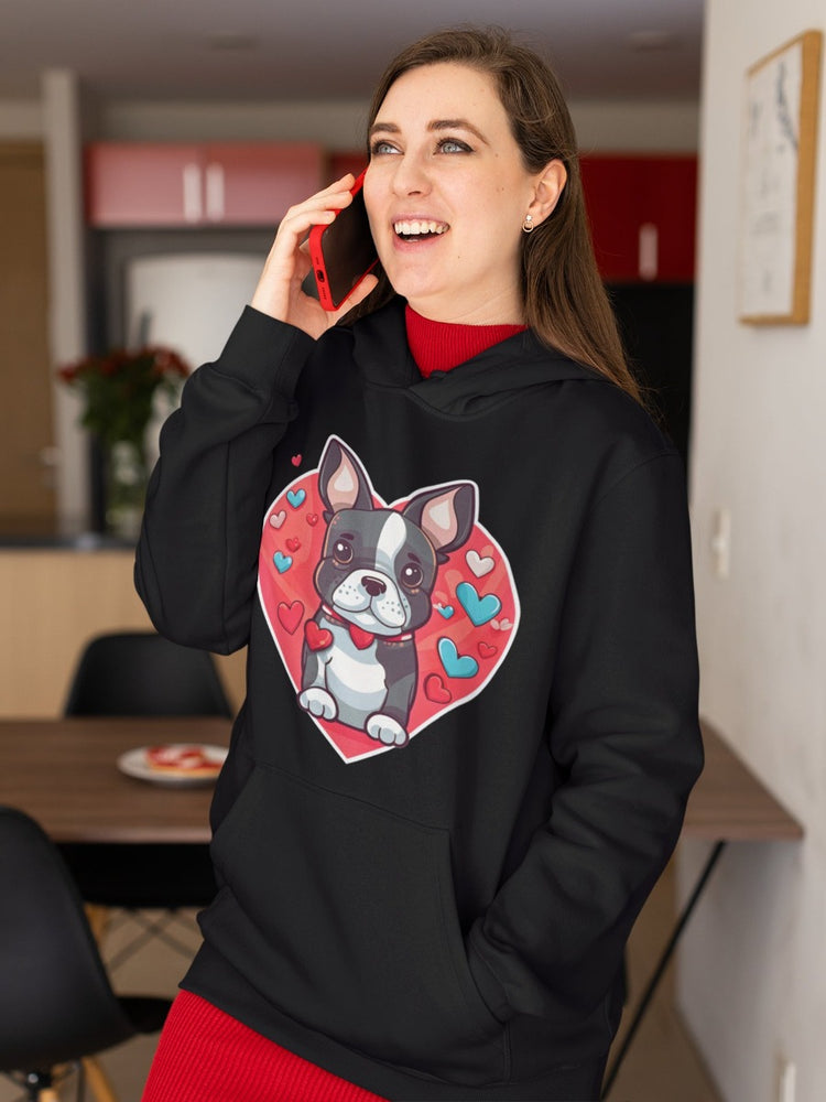 This hoodie sweatshirt showcases the cutest Boston Terrier boy standing confidently in front of a vibrant red heart surrounded by a shower of multicolored hearts. It's a heartwarming design that perfectly captures the playful and affectionate nature of Boston Terriers.