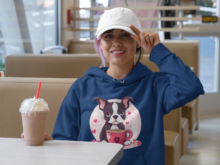 If you're a coffee enthusiast and a Boston Terrier lover, this hoodie is the perfect combination of your two passions. Featuring the cutest Boston Terrier standing behind a pink coffee cup adorned with pink hearts, this design captures the beauty and adorability of both your love for coffee and your fondness for Boston Terriers.