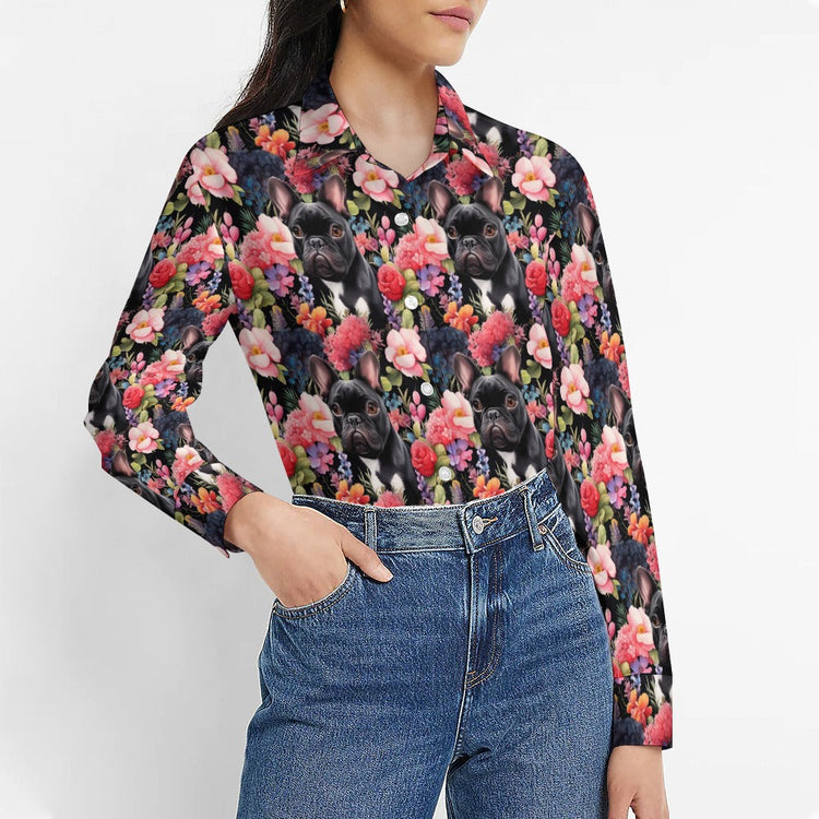 Capture the essence of chic style and canine charm with our Botanical Beauty Black French Bulldog Women's Shirt.