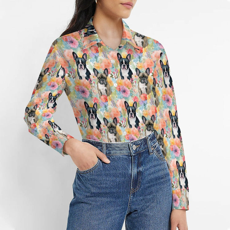 Embrace the blooming elegance of the Brindle and Black Frenchies in Bloom Women's Shirt, a seamless blend of artistry and comfort.