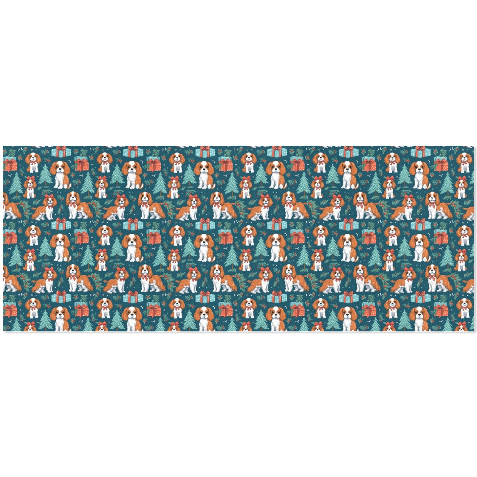 Each roll features charming Cavaliers, their soft eyes and floppy ears captured in affectionate detail. Set against a deep navy backdrop, the whimsical elements of Christmas—evergreen branches, holly berries, and cheerful presents—shine brightly.