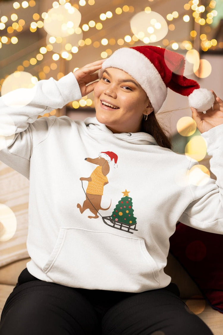 The highlight of this hoodie is the adorable Dachshund design. It features a Dachshund wearing a red Santa hat, pulling a Christmas tree on a sleigh. The charming and festive design adds a touch of holiday cheer to your outfit, making it perfect for Christmas gatherings and celebrations.