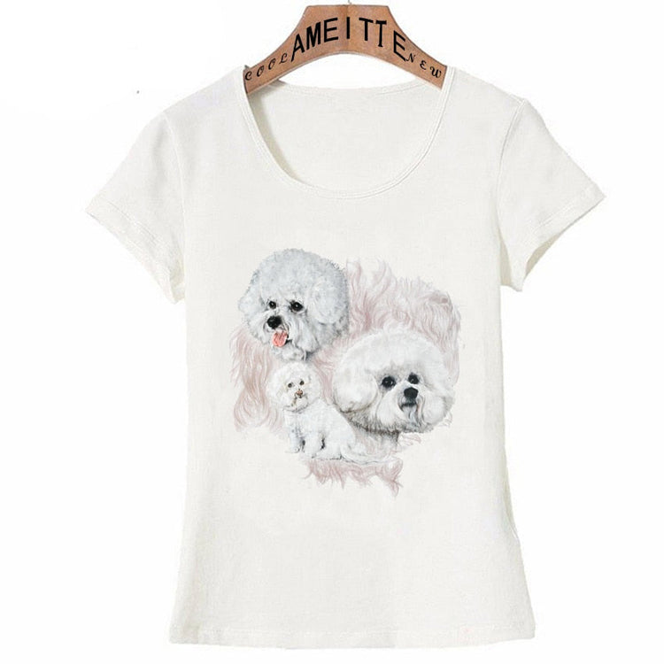 Image of a super cute and timeless Bichon Frise t-shirt in three Bichon Frise print design